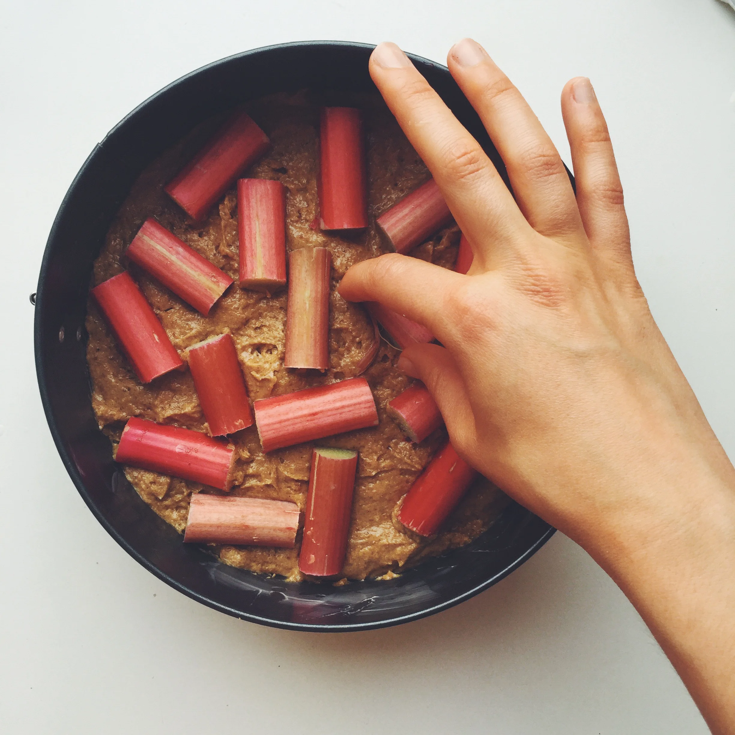 Pour batter into cake tin and use the spatula to ensure you have a flat surface and the cake tin has an even fill. Arrange your rhubarb pieces on top of the cake.